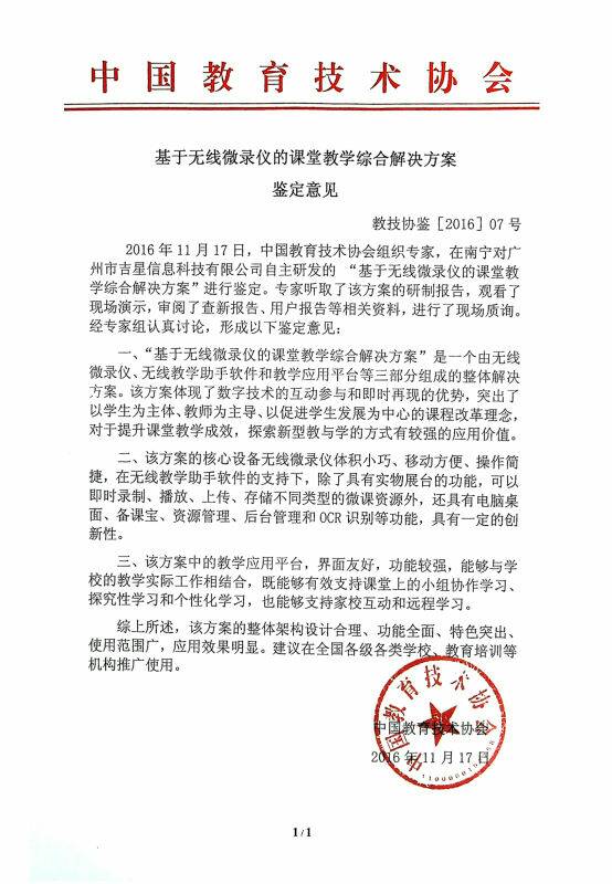 2016年11月17日,中國教育技術協會組織專家,在南寧對廣 州市吉星信息科技有限公司自主研發的“基于無線微錄儀的課堂教 學綜合解決方案”進行鑒定。專家聽取了該方案的研制報告,觀看了 現場演示,審閱了查新報告、用戶報告等相關資料,進行了現場質詢。 經專家組認真討論,形成以下鑒定意見: